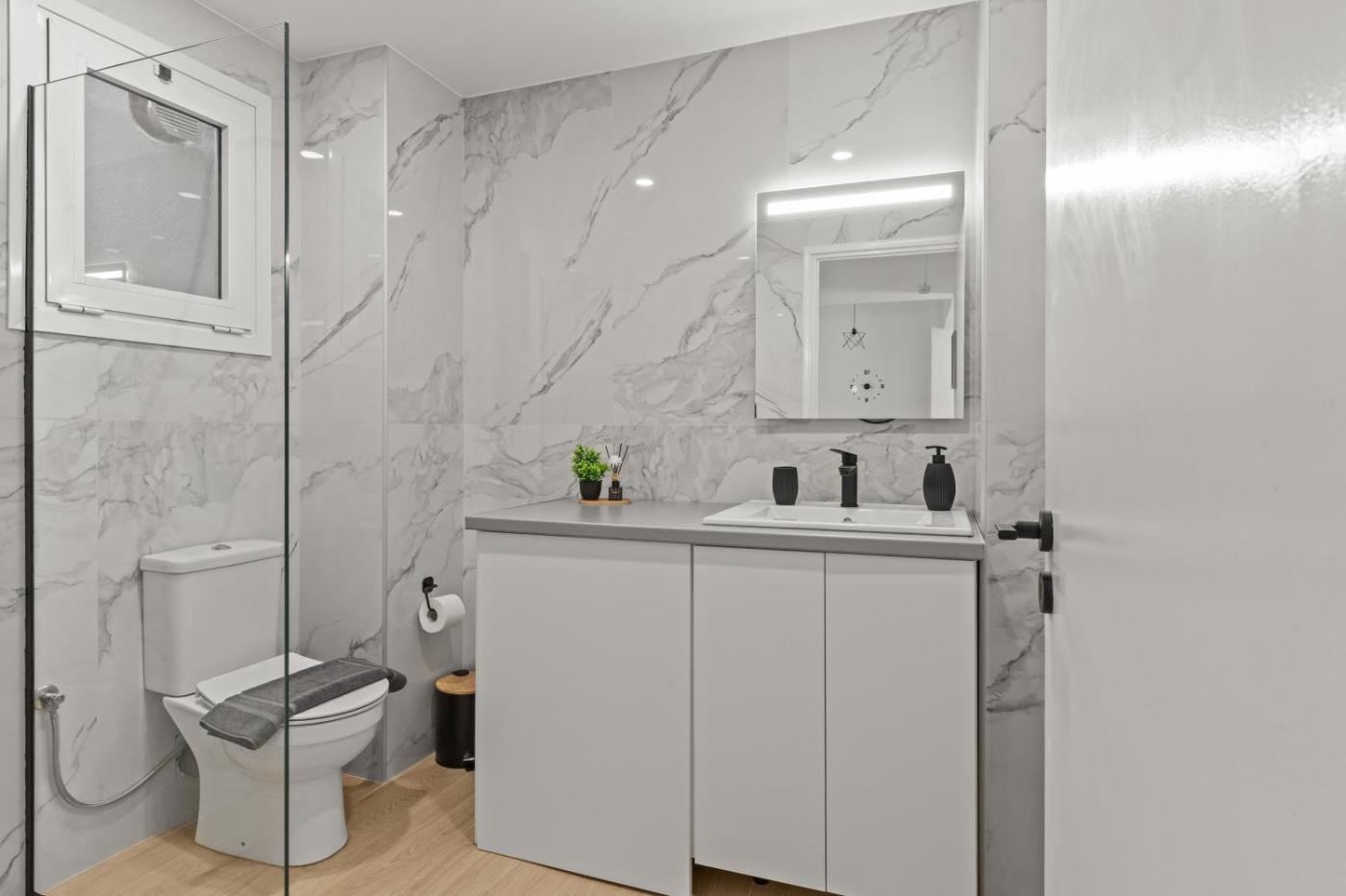 One-Bedroom Apartment. Boasting a private entrance, this air-conditioned apartment includes 1 living room, 1 separate bedroom and 1 bathroom with a shower and a hairdryer. Meals can be prepared in the well-fitted kitchen, which is fitted with a stovetop, a refrigerator, kitchenware and an oven. The apartment has tiled floors, a seating area with a flat-screen TV, a washing machine, soundproof walls, as well as a tea and coffee maker. The unit has 2 beds.